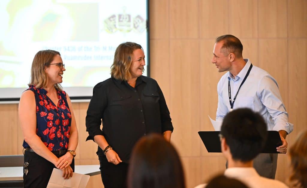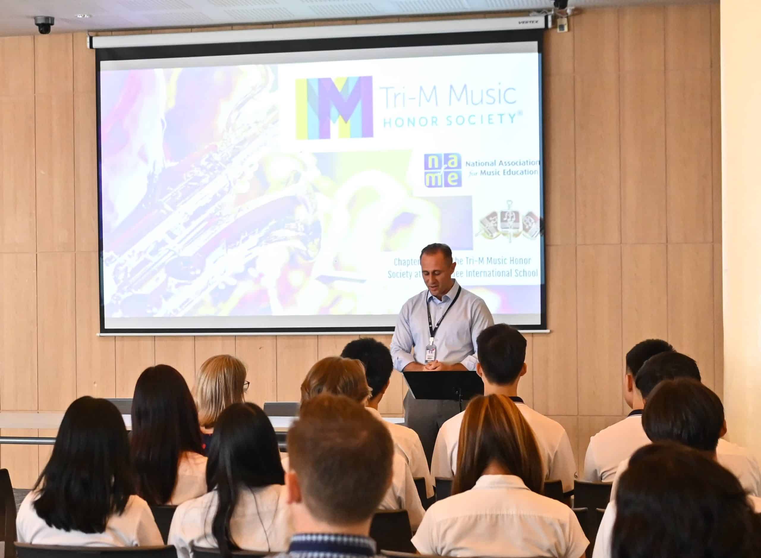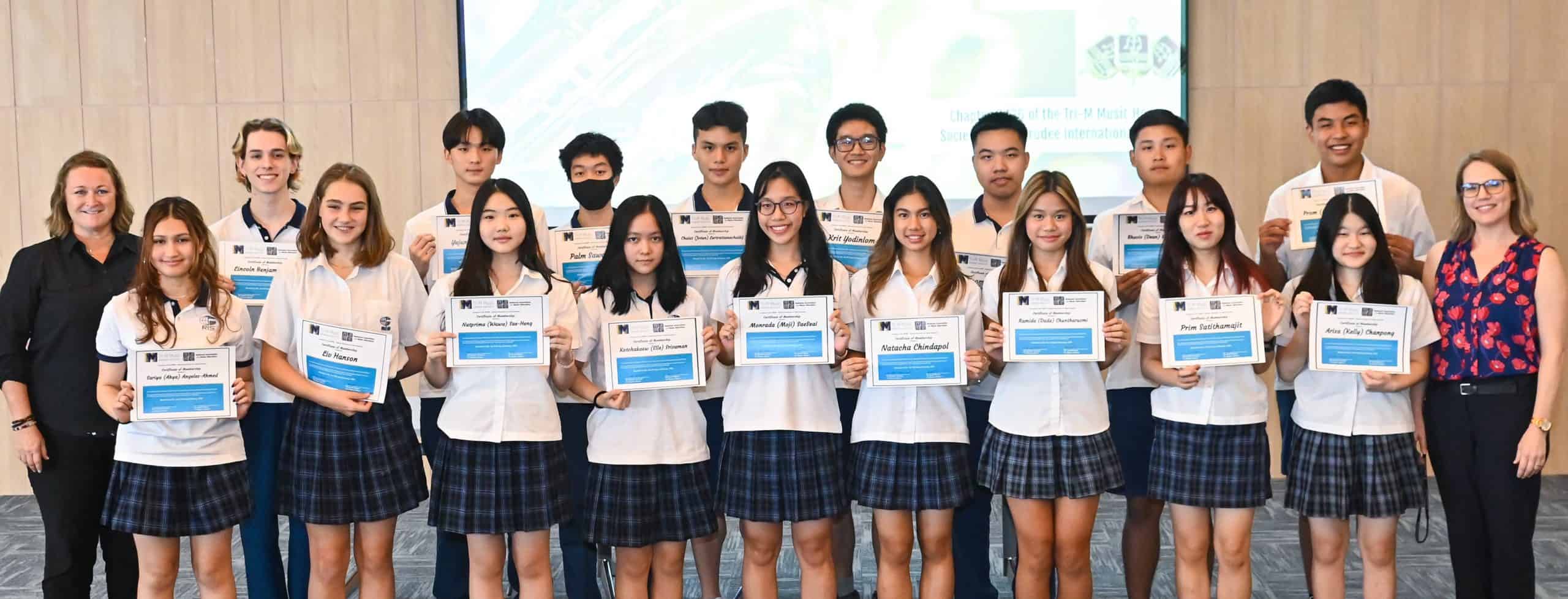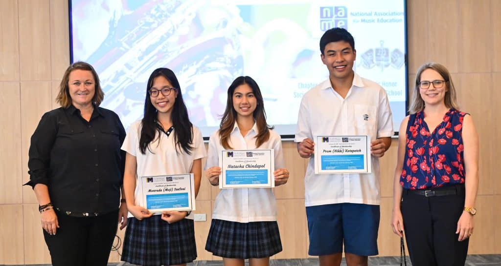 Chapter co-advisors and beloved high school music teachers Ms. Sarah Hanson and Ms. Jennifer Forsland presented RIS Tri-M’s officers—Prom (Nikki) Kotepech (Co25), Monrada (Moji) Sae-Seai (Co24), and Natacha Chindapol (Co27), who will serve as President, Vice-President, and Secretary, respectively.